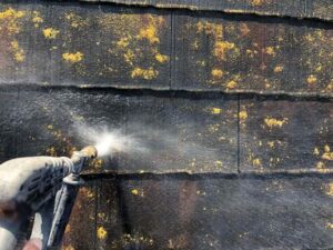 屋根表面の汚れ・苔・カビを丁寧に洗い流します。これを怠ると、塗料の密着が悪くなります。