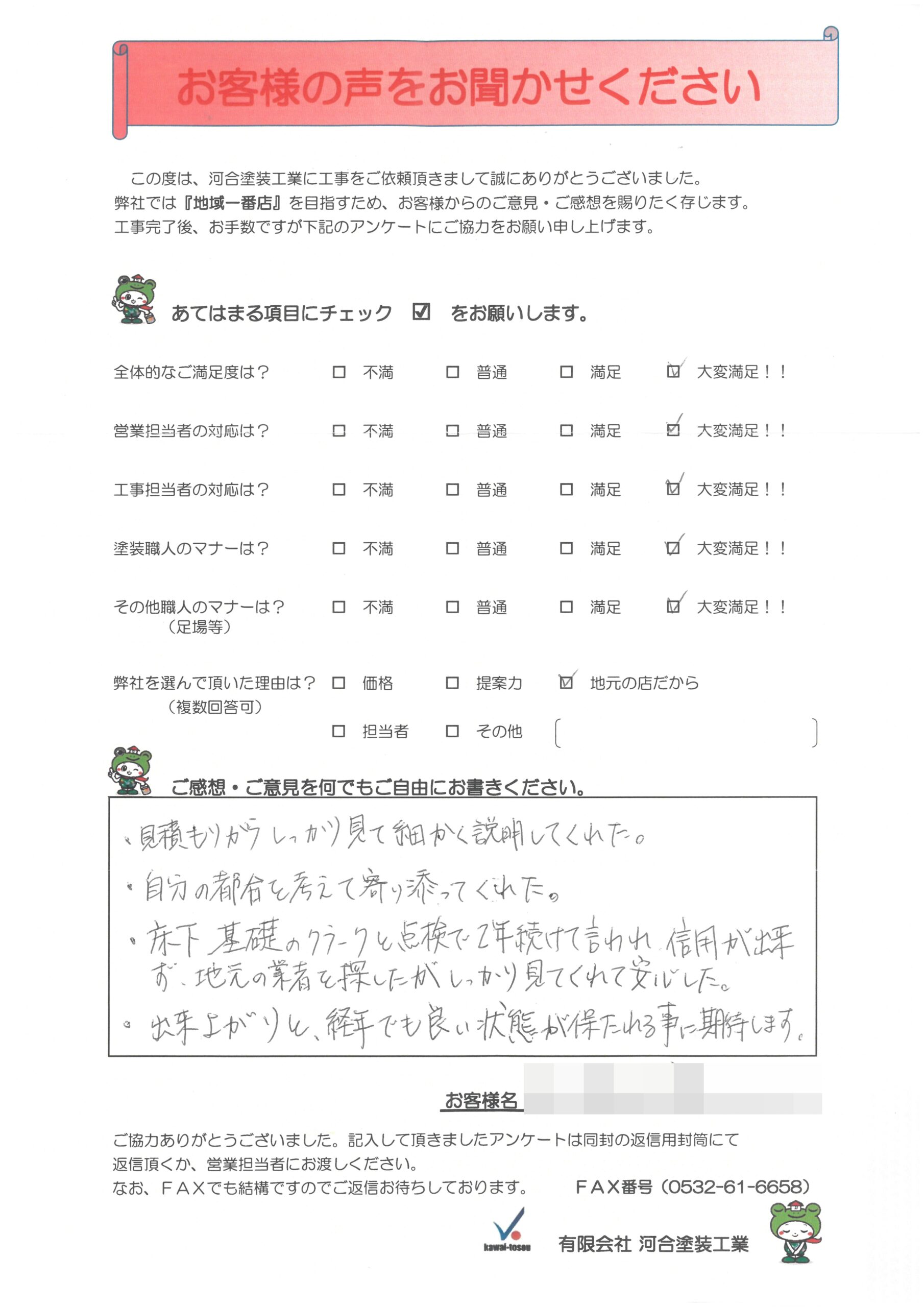 工事中は、日々の作業内容を丁寧に説明してくださるなど、現場監督、職人さんとも信頼のおける親身の対応でした。仕上がりは目につきにくい細かなところも含め丁寧に塗装されていると感じることができ、とても満足しています。