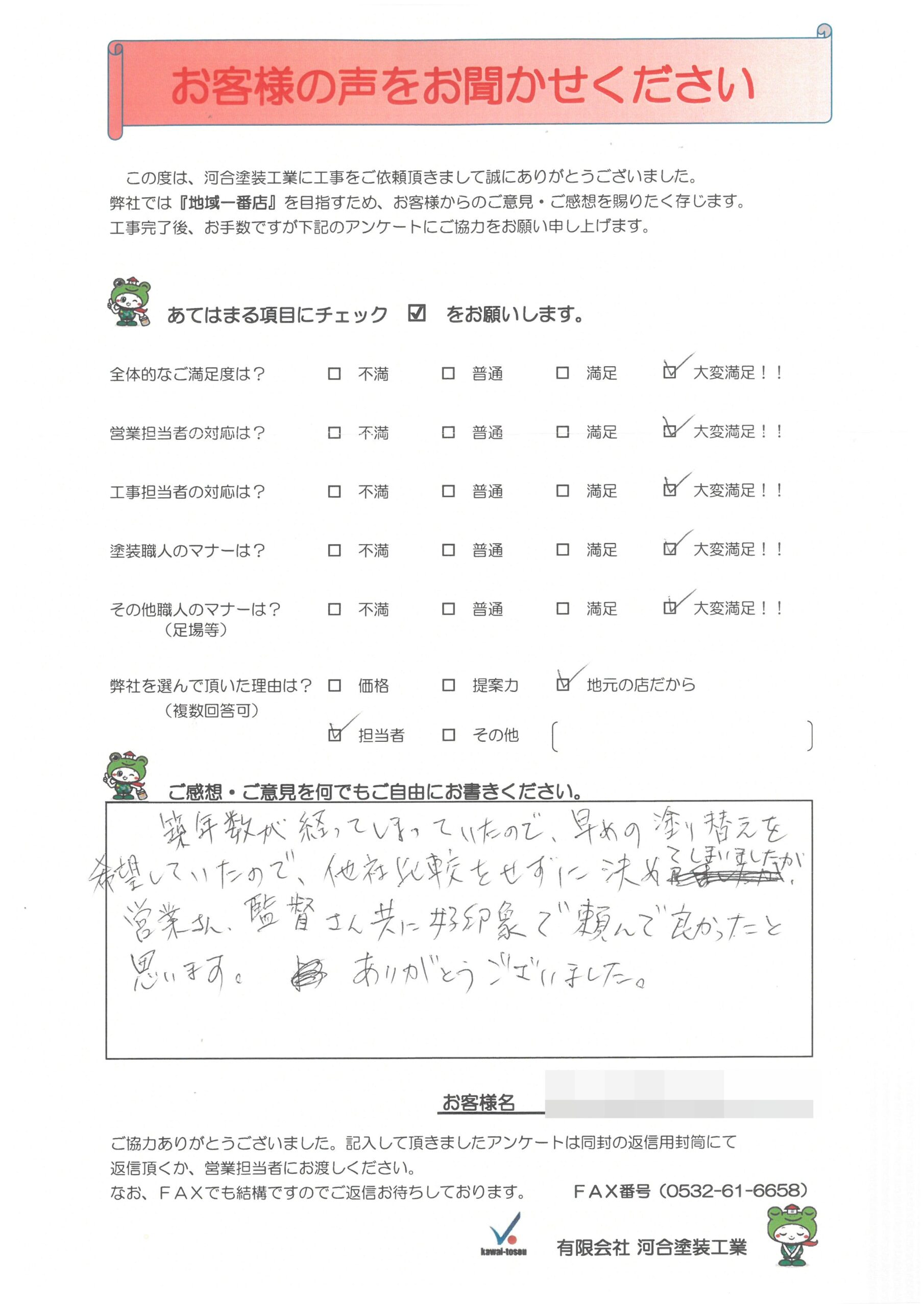 初めての外壁塗装で不安もありましたが、分かりやすい塗装や工程の説明、現場担当者さんも現場状況を作業前、後に報告をして頂けたので最後まで不安なく終えることが出来ました。